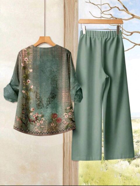 طقم نسائي أوف وايت مزخرف مع بنطلون أسود واسع