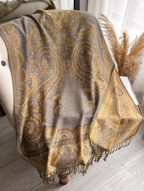 طرحه شال تراثي فاخر بنقوش ذهبية – رمادي دافئ