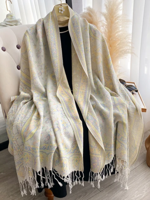 طرحة شال باللون الأصفر الفاتح بنفشة تراثية ناعمه
