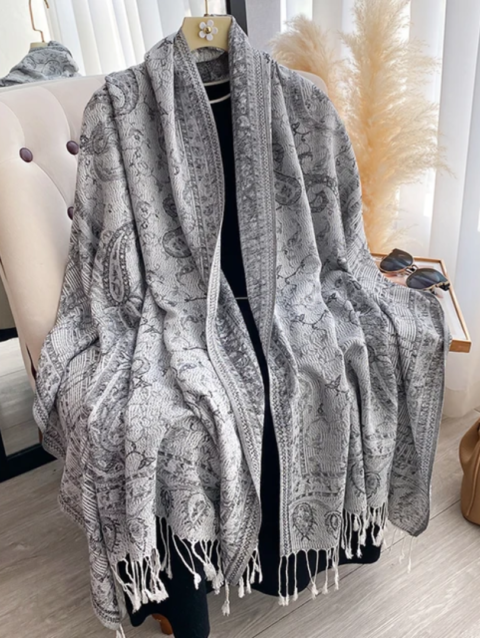 طرحه شال باللون الرمادي الفاتح بنقشة تراثية أنيقة