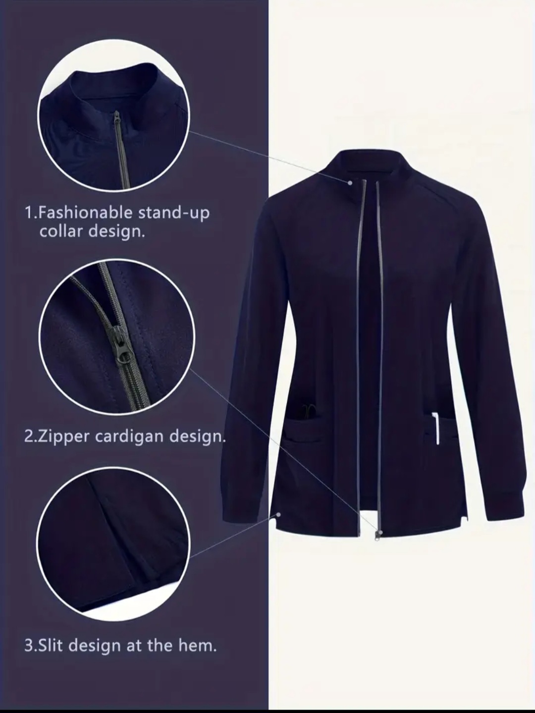 جاكيت طبي أنيق باللون الكحلي او (الازرق ) الغامق، تصميم عملي بسحّاب أمامي، مثالي للعمل اليومي والأجواء الباردة داخل المستشفيات والعيادات.