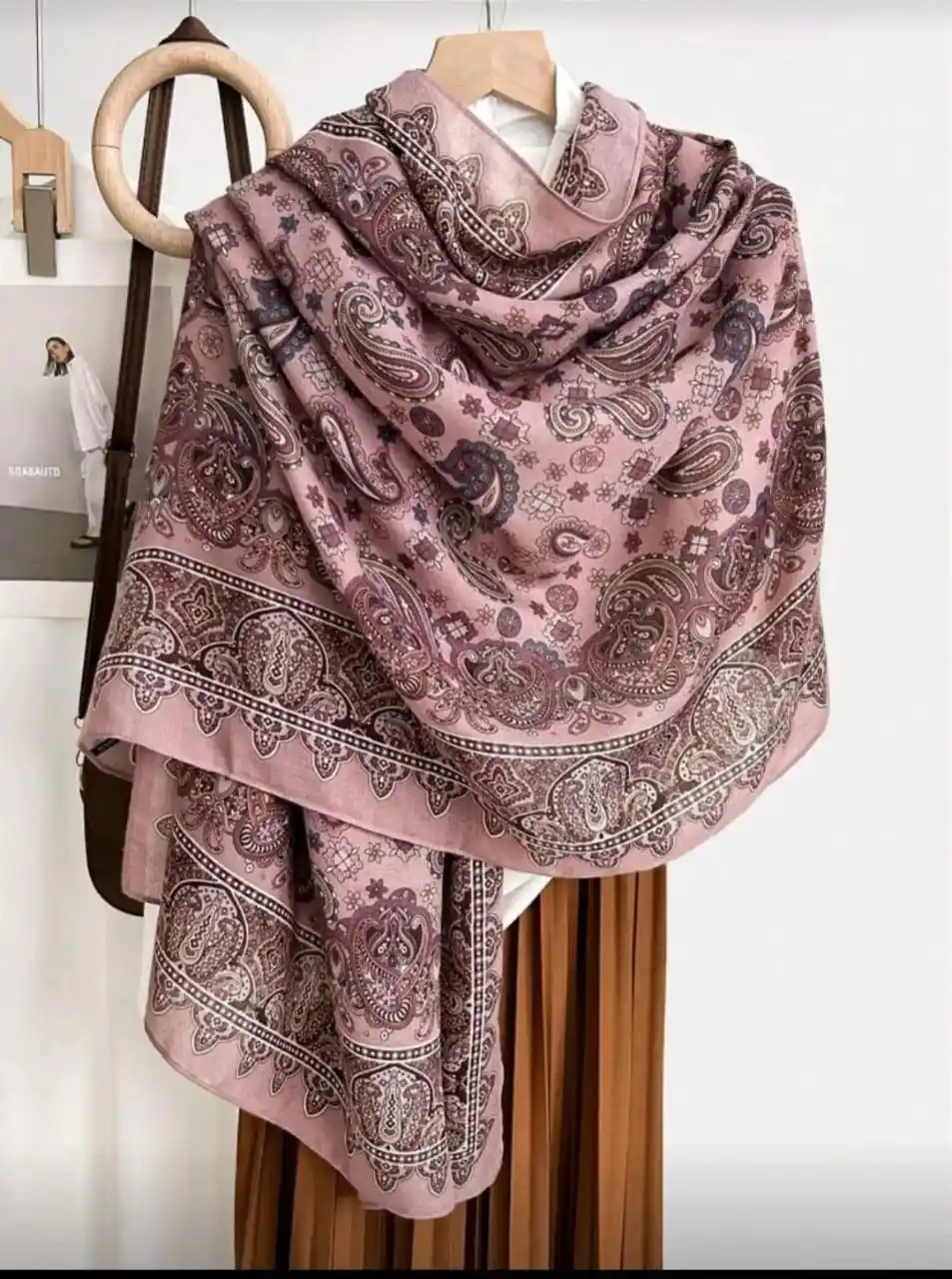 أناقة ناعمة: وشاح بلون البنفسجي الهادئ ونقوش البيزلي الراقية. استمتعي بإضافة لمسة من الرقة والدفء إلى مظهرك مع هذا الوشاح الأنيق. يتميز بلون بنفسجي باهت هادئ (أو وردي ترابي)، وتغطيه نقوش البيزلي (Paisley) الكلاسيكية المعقدة، الممزوجة بتفاصيل داكنة وفاتحة، مما يضفي عليها مظهراً فاخراً وأنثوياً.