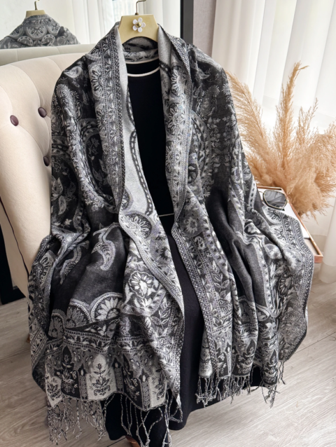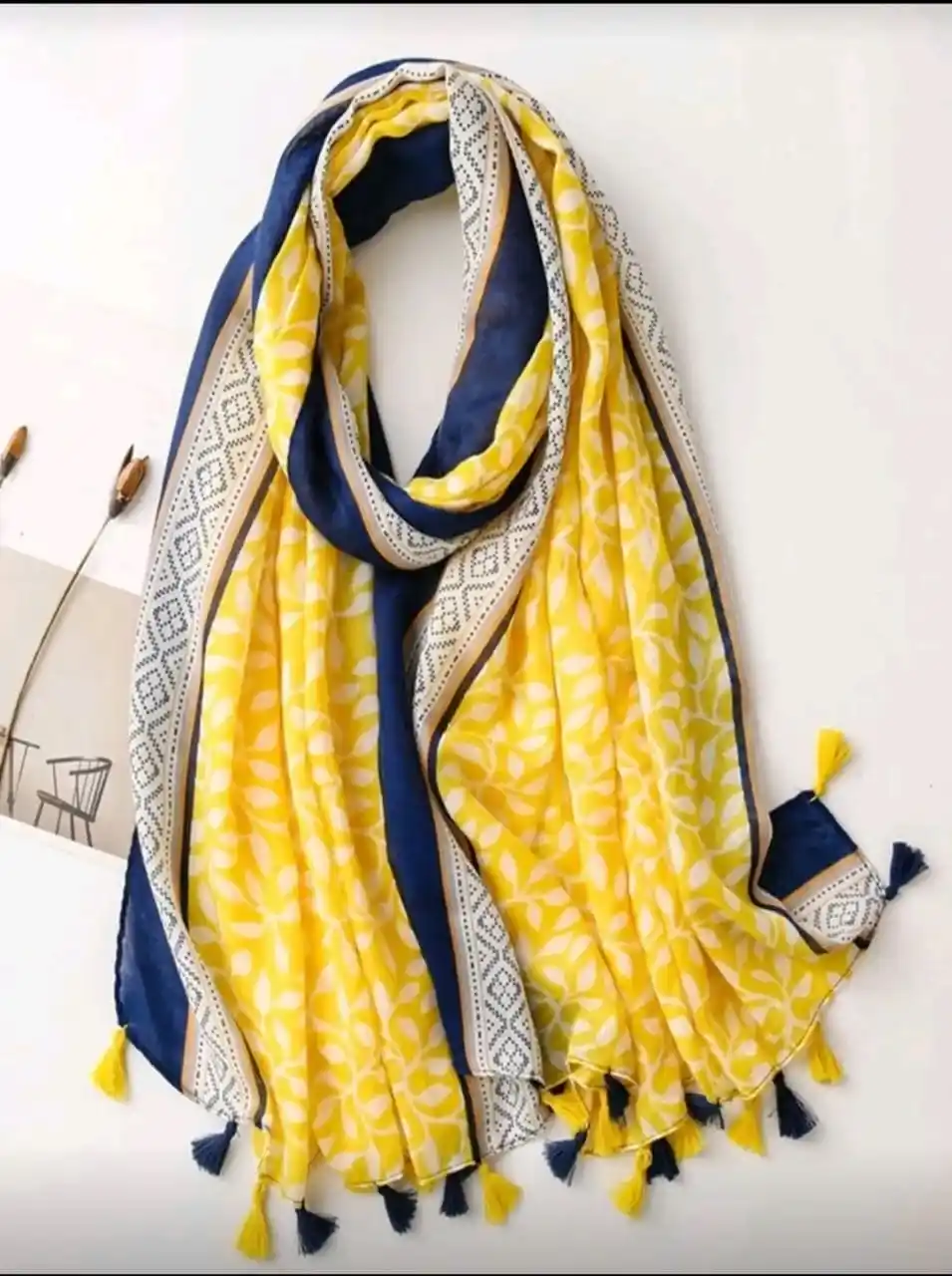 طرحة (وشاح) صفراء وزرقاء متباينة (Tassel Scarf): وشاح خفيف وحيوي، يجمع بين الأصفر الساطع والأزرق الداكن بنقوش بيضاء وتفاصيل هندسية تراثية، ومزود بشراشيب ملونة.