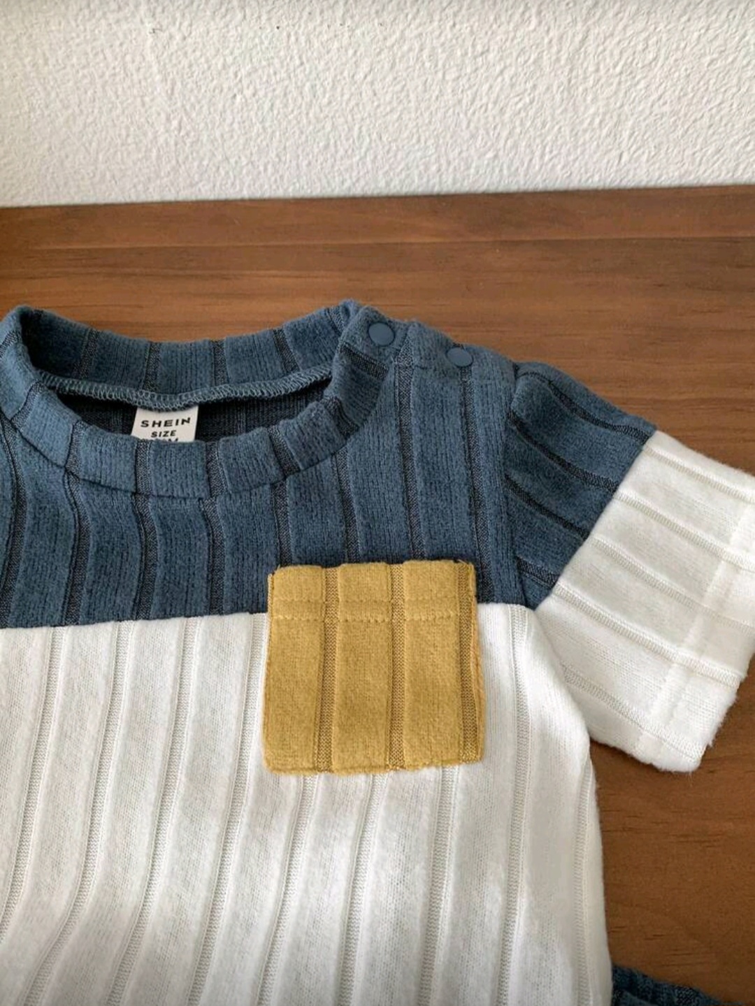 امنحي طفلك إطلالة عصرية ومريحة مع هذا الطقم الصيفي الجميل المكون من قطعتين. يأتي الطقم بتصميم مميز يجمع بين الألوان الهادئة والخامة المريحة، حيث يتكون من تيشيرت قصير الأكمام بتفاصيل أنيقة وجيب صغير في الأمام، مع شورت مريح بخصر مطاطي ورباط قابل للتعديل.