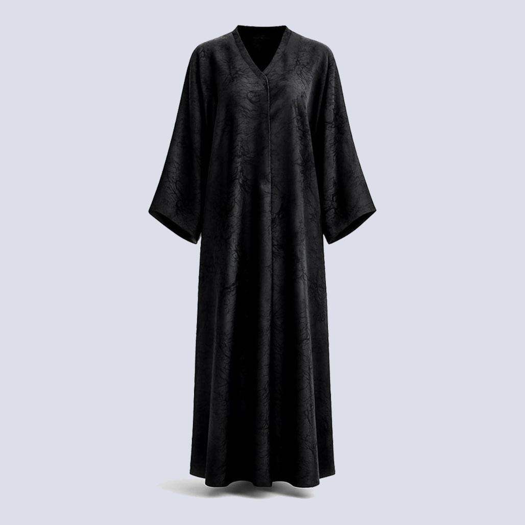 ارتقي بإطلالتك المسائية أو المناسبات الخاصة مع هذه العباية المصممة بلمسة من الفخامة والرقي. تتميز العباية بلون أسود كلاسيكي وغني، وتزينها نقوش بارزة (Jacquard/Embroidery) مستوحاة من فروع المرجان المتشابكة أو جذور الأشجار، مما يمنحها عمقاً وتركيباً فريداً.