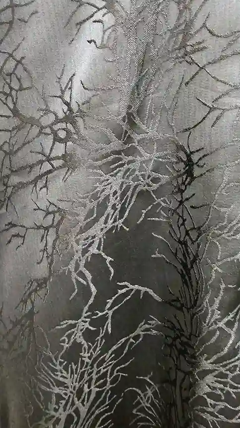 نقش المرجان البارز: يتميز النسيج بنقوش غائرة وبارزة متدرجة (انظر صور النسيج عن قرب)، مما يضيف بعداً بصرياً وتأثيراً فريداً يحاكي فروع المرجان أو الشجر، وتظهر النقوش بشكل أوضح تحت الإضاءة.