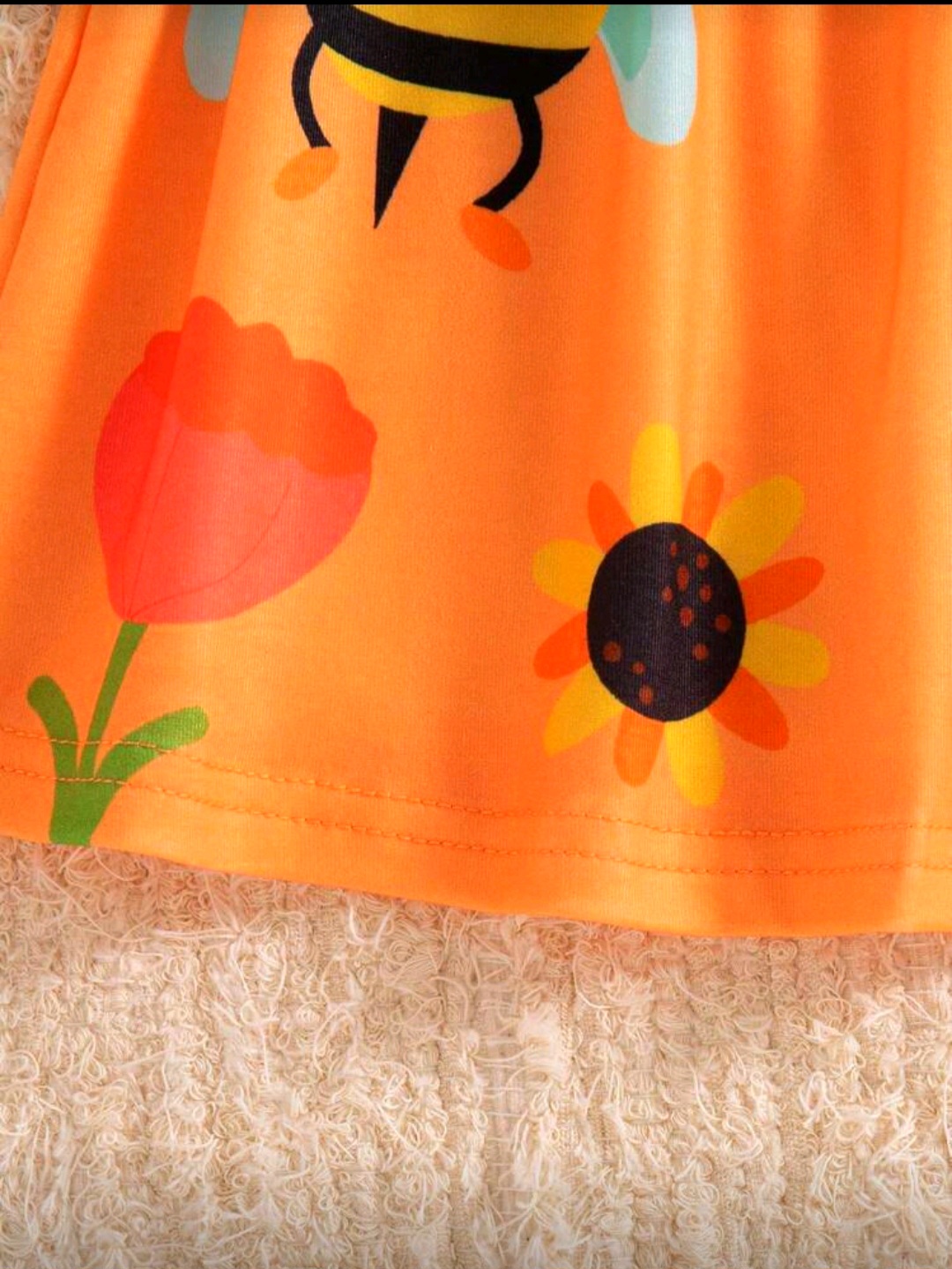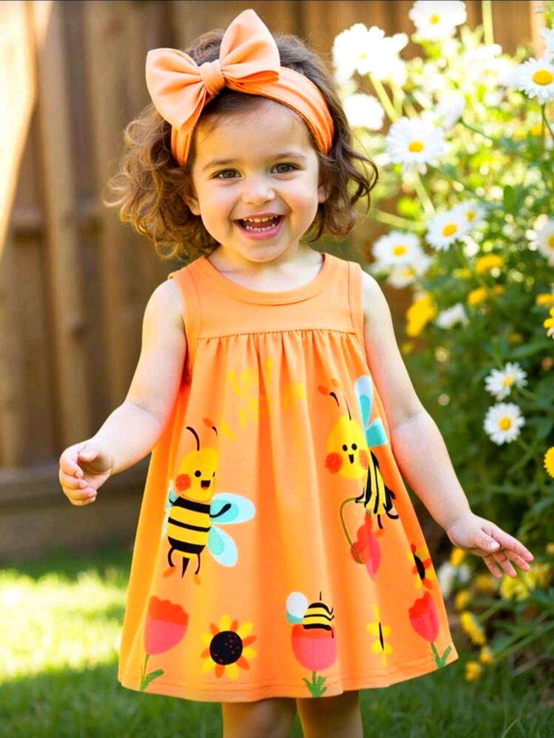 امنحي طفلتك إطلالة مرحة وجميلة مع هذا الفستان البناتي الرائع باللون البرتقالي المشرق والمزين بطبعات النحل والزهور الملونة التي تضيف لمسة طفولية جذابة.