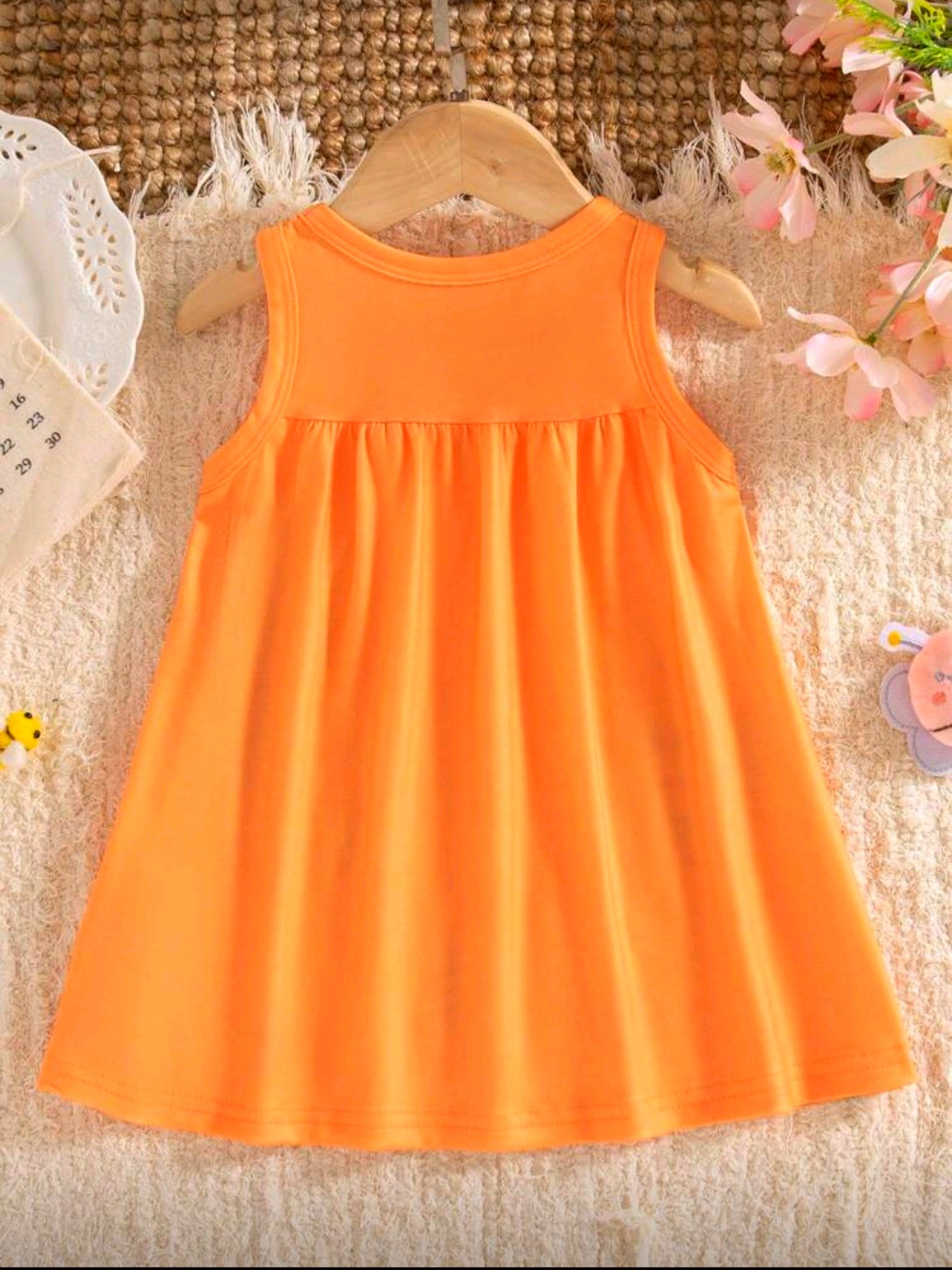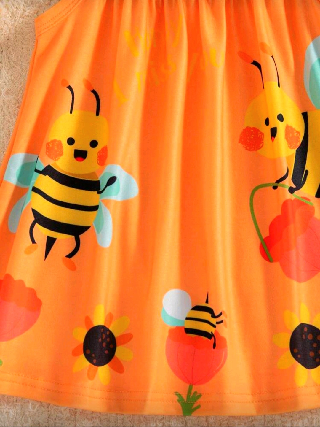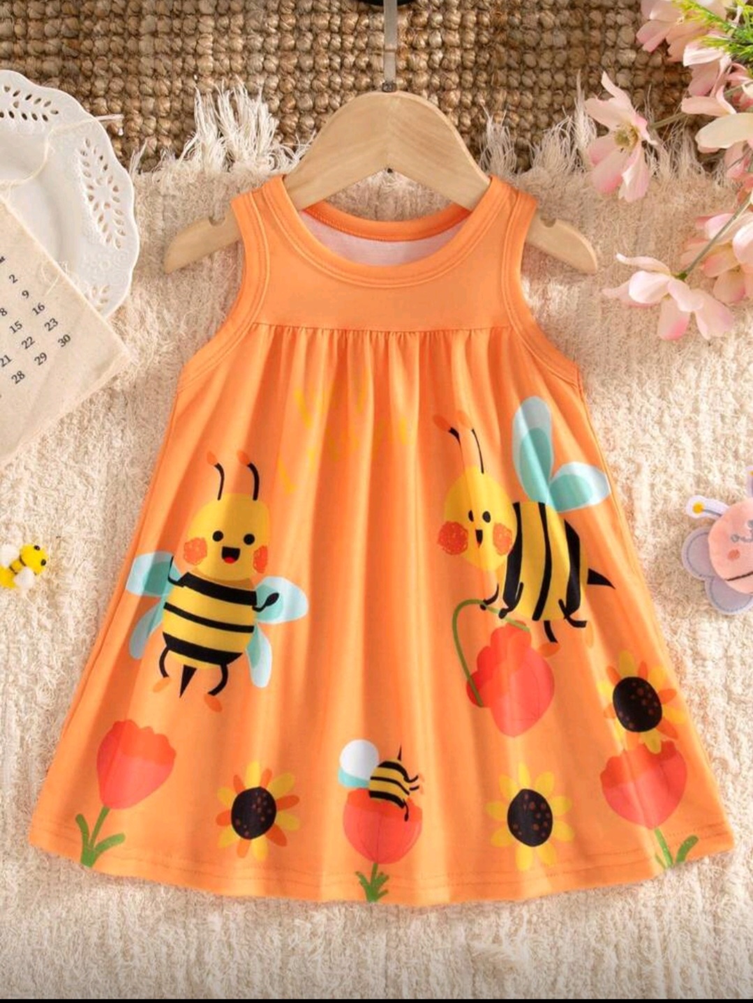 فستان أطفال بناتي لطيف باللون البرتقالي مع طبعة نحل وزهور مرحة، تصميم مريح بدون أكمام مناسب للأعمار من 6 شهور إلى 3 سنوات.
