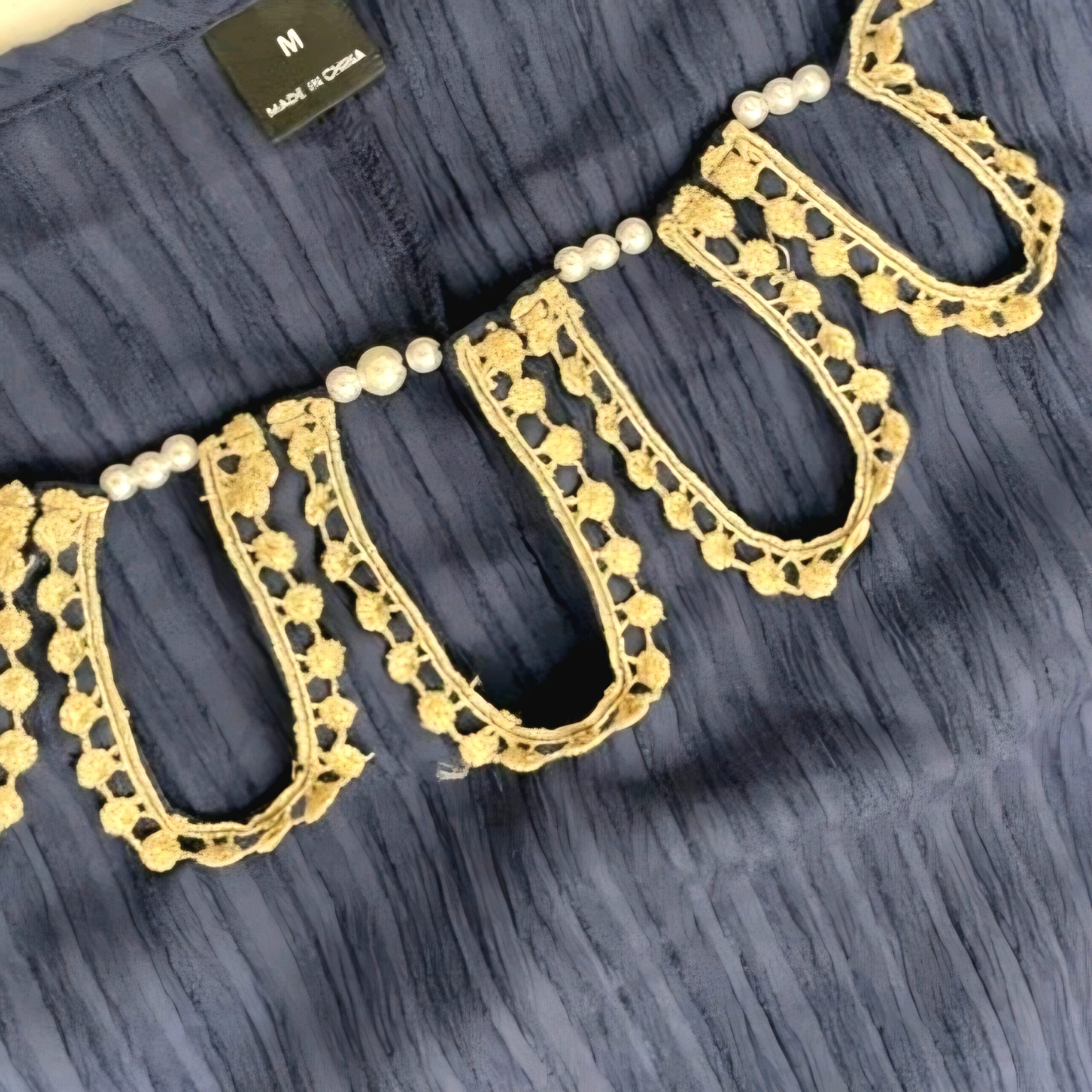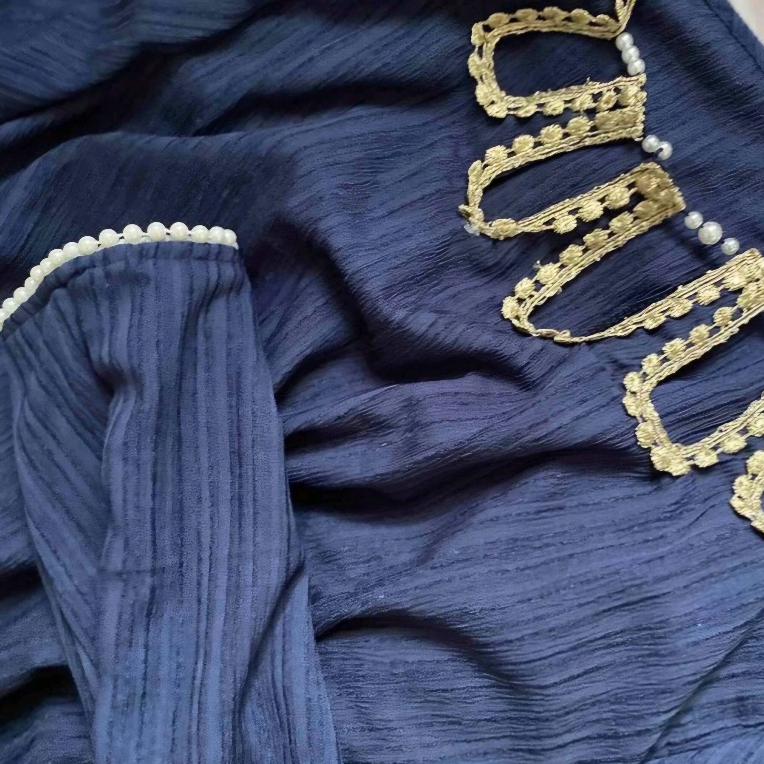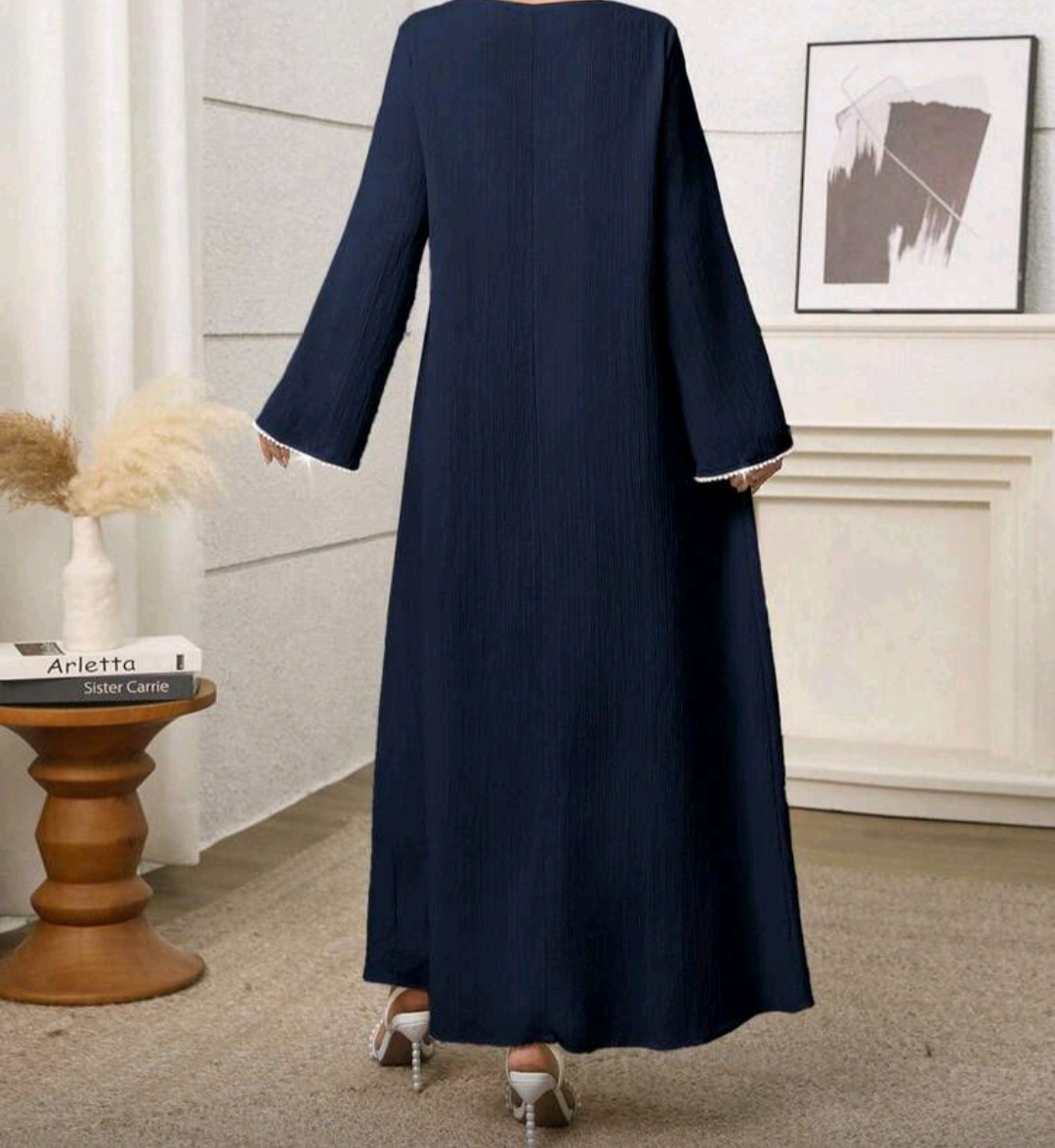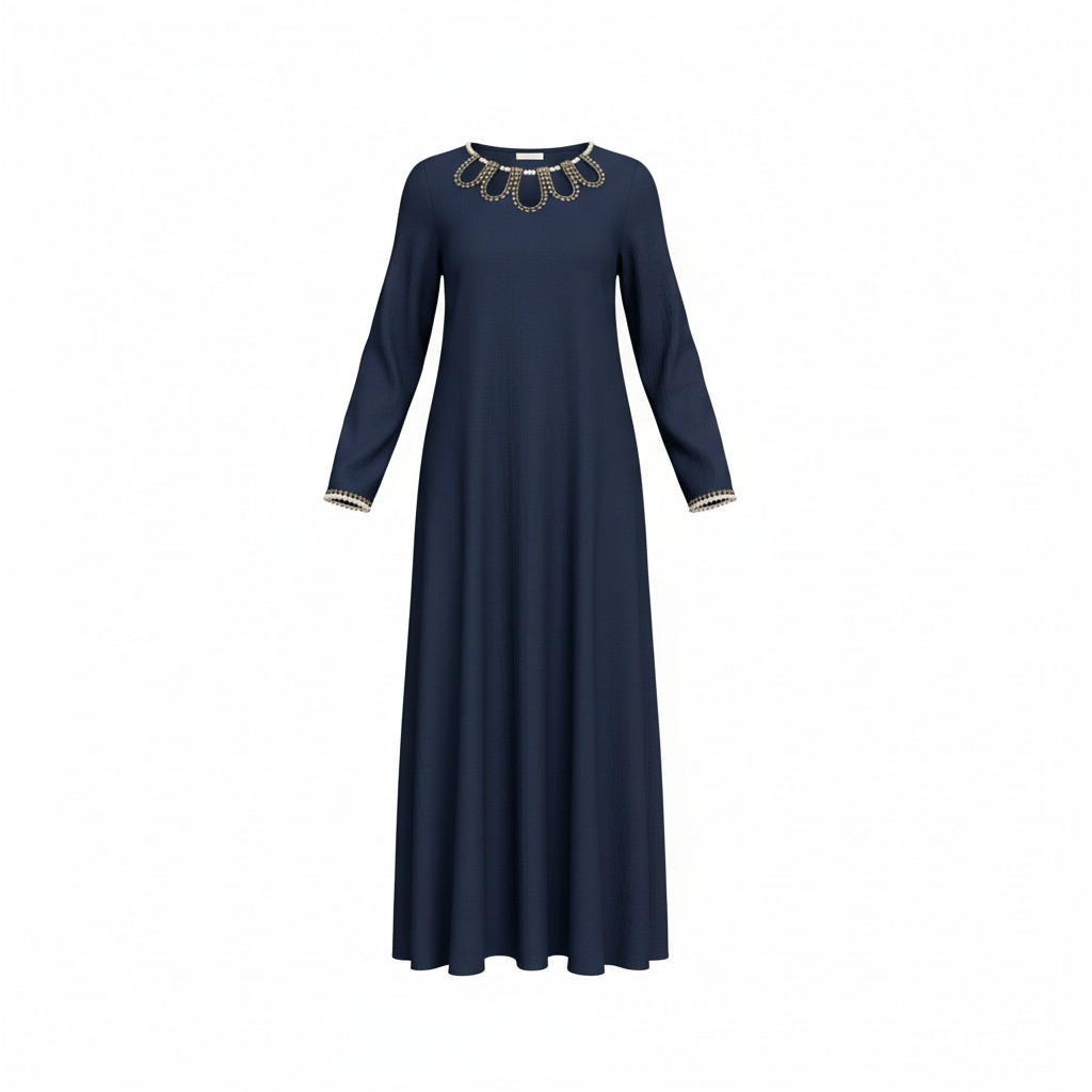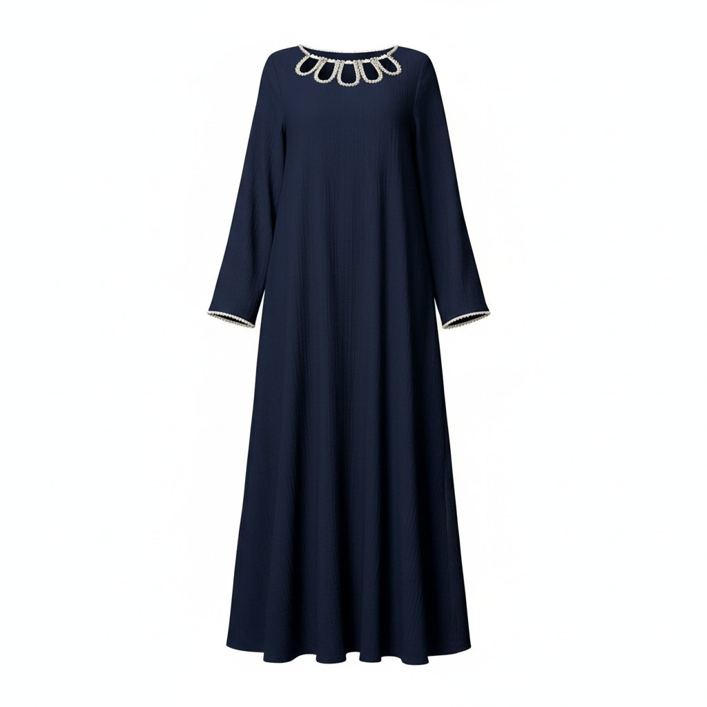 فستان نسائي طويل بتصميم أنيق باللون الأزرق البحري، مزين بتطريز لؤلؤ فاخر حول الياقة مع أكمام طويلة وقصة مريحة تمنحك إطلالة راقية تناسب المناسبات والسهرات.