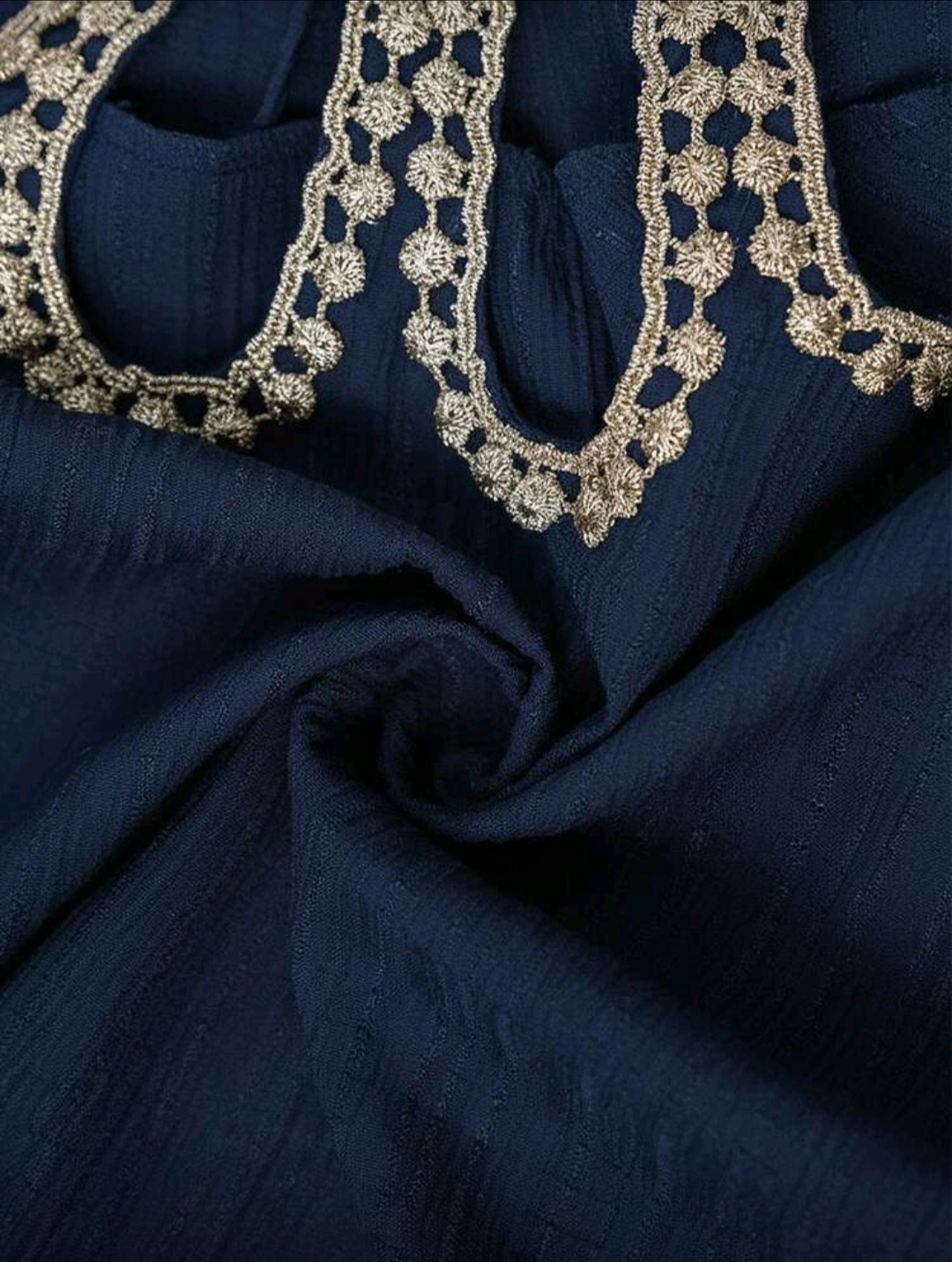يأتي الفستان بقصة واسعة وانسيابية تمنحك الراحة والحركة بسهولة، مع أكمام طويلة بتصميم أنيق تضيف لمسة من الرقي والأنوثة. اللون الأزرق البحري يمنح الفستان طابعاً كلاسيكياً راقياً يجعله مناسباً لمختلف المناسبات مثل السهرات، المناسبات العائلية، والزيارات الرسمية.