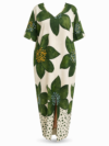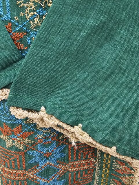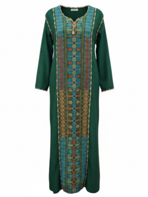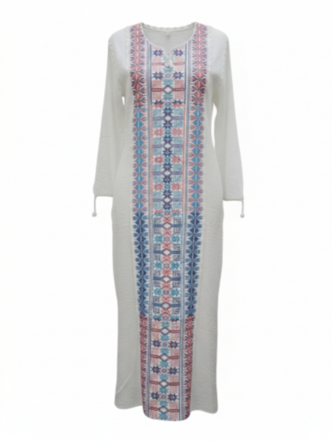 يتميز الفستان بقصة فضفاضة مريحة تناسب مختلف أشكال الجسم وتوفر حرية الحركة طوال اليوم، كما يأتي بياقة على شكل V تضيف لمسة أنثوية جذابة. الأكمام القصيرة الواسعة مزينة بزخارف بيضاء أنيقة، بالإضافة إلى تفاصيل مميزة في أسفل الفستان تمنحه طابعاً عصرياً جذاباً.