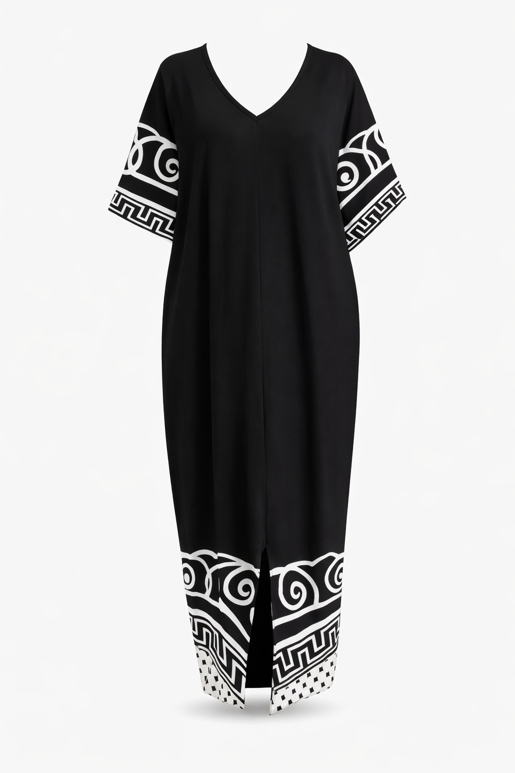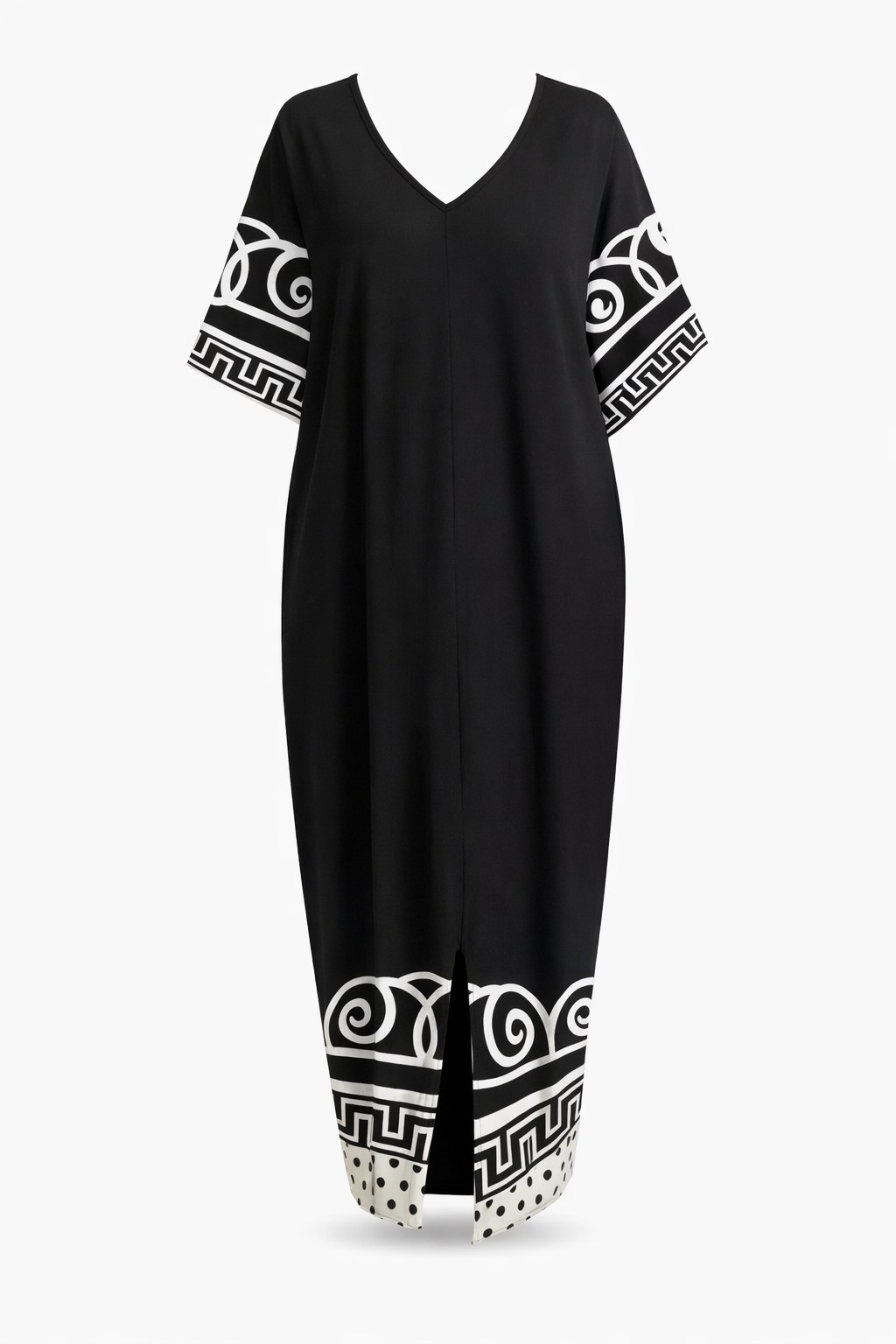 فستان نسائي طويل باللون الأسود مع تفاصيل بيضاء أنيقة، يتميز بياقة على شكل V وقصة فضفاضة مريحة مع زخارف عصرية على الأكمام والحافة السفلية، مناسب للإطلالات اليومية والمناسبات.