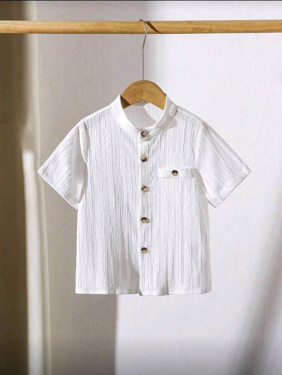 قميص أطفال أنيق باللون الأبيض بتصميم بسيط وأزرار أمامية مع ياقة دائرية عصرية، مصنوع من قماش خفيف ومريح يمنح الطفل مظهراً أنيقاً ومناسباً للخروج والمناسبات.