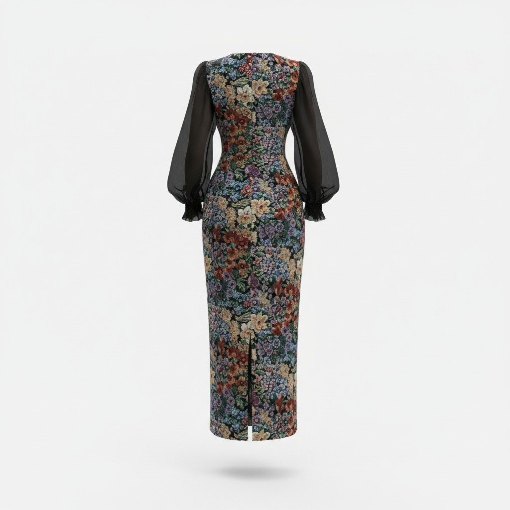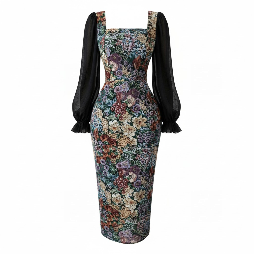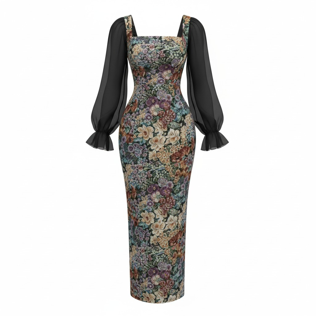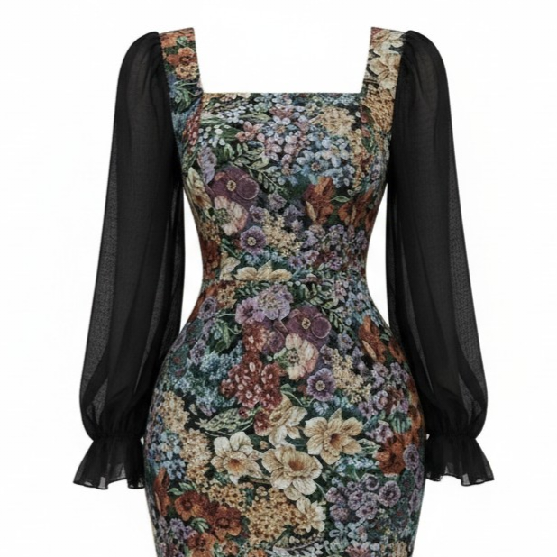 فستان نسائي طويل بطبعة زهور أنيقة مع ياقة مربعة وأكمام شيفون شفافة، تصميم أنثوي يبرز الخصر ويمنحك إطلالة راقية للمناسبات والسهرات.